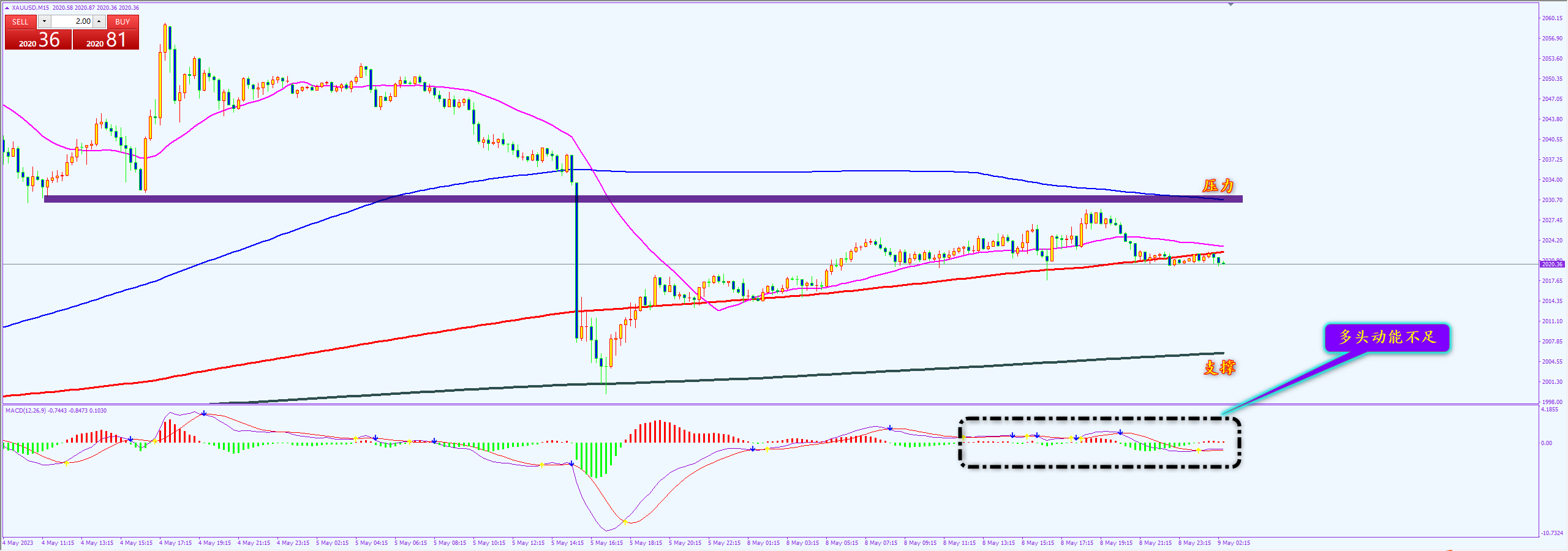 通过对黄金15分钟图解析得知,黄金昨日小幅震荡一直维持在2020一线,昨日就已经说过,反弹的动能有所欠缺冲高回落的可能性更大一点,目前我们从下方的ACD也可以清楚地看到多头的能量柱明显不足上方依然是在2031下方运行短期冲高回落的可能性比较大一点,虽然下方有支撑(2005一线)从理论上来讲应该是有一个回调确认支撑
