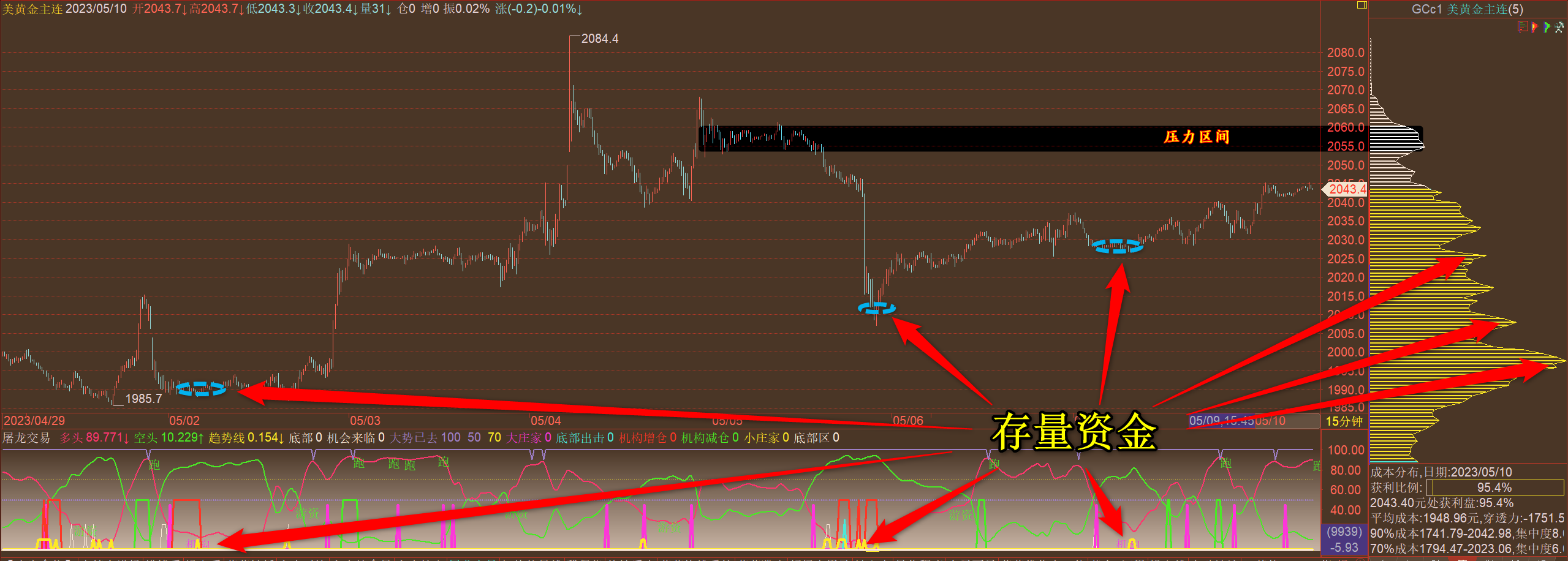 通过对黄金小时图解析得知,昨日行情再次先跌后涨再下跌,昨日晚间就已经专门说过在下方已经发现多头主力增仓进入导致一波反弹上涨晚间一度到达上方2060一线,目前有所回落调整但是我们从下方的附图可以清楚的看到目前再次看到多头主力有减仓动作,说明行情将会再次回落调整一下,下方我们继续关注2030和2016一线的强支
