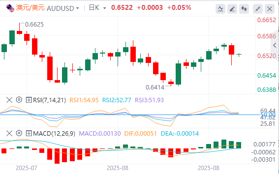 主要支撑位在0.6516的9日均线,其次是50日均线0.6502。跌破这一关键支撑区域将导致看跌倾向的出现,并促使澳元/美元测试8月21日创下的三个月低点0.6414。