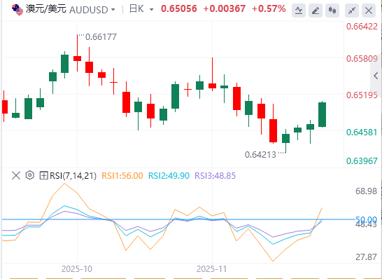 澳储银行11月会议纪要显示,央行可能会在较长时间内维持利率不变。ASX 30天银行间现金利率期货显示,截至11月25日,2025年12月合约交易为96.41,这意味着在即将召开的澳储银行董事会会议上,利率从3.60%降至3.35%的概率为6%。