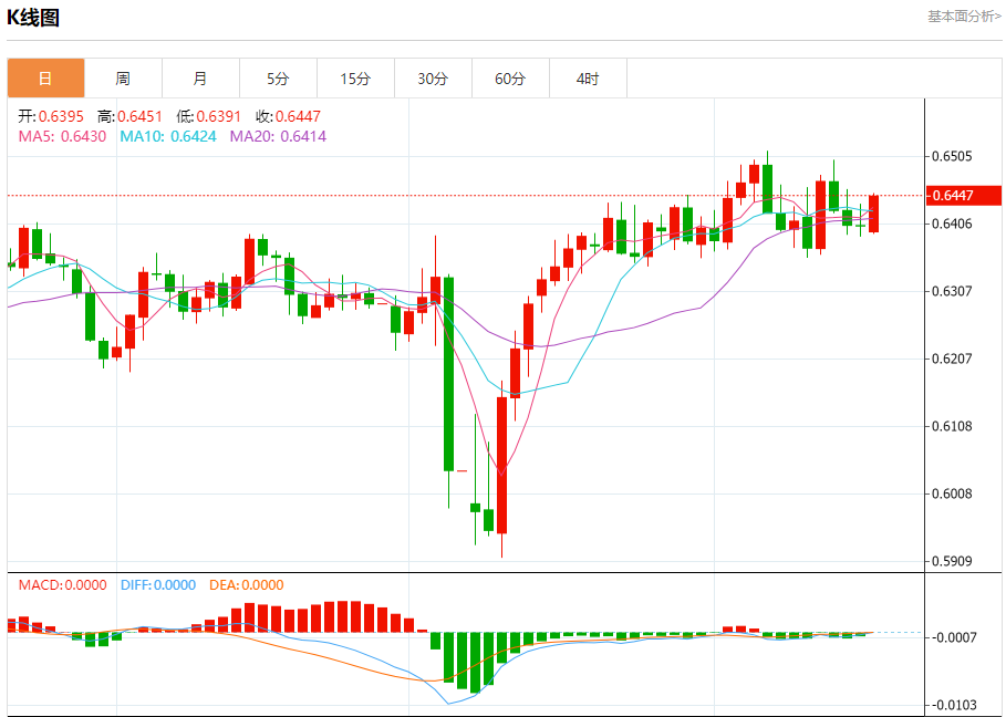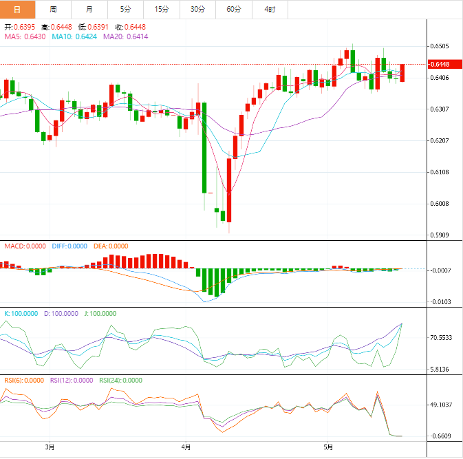澳元兑美元今日汇率最高0.6433,最低0.6431,涨跌0.0029,涨跌幅0.45%。 市场基本面分析 澳大利亚统计局最新公布的就业数据显示,4月份新增就业人数达89000人,远超市场预期的20000人增幅,也大幅高于3月份向上修正后的36400人。与此同时,失业率保持在4.1%不变,符合预期。就业数据公布后,澳元兑美元曾