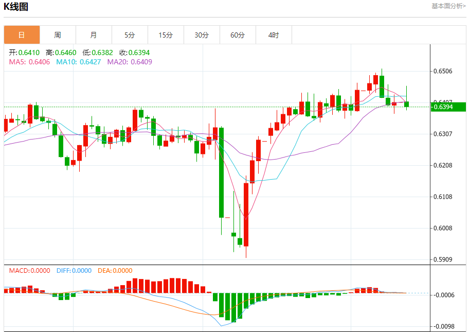 澳元兑美元今日汇率最高0.6432,最低0.6431,涨跌0.0025,涨跌幅0.39%。 市场基本面分析 周一将公布的贸易协议细节,将影响澳元的中期走势,若突破0.6550,将有可能冲向去年9月30日高点0.69435,印度/巴基斯坦脆弱的停火协议仍令亚洲市场担忧,周二将公布美国CI,周四将公布澳洲就业数据(市场预测就业岗