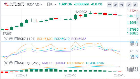 美元/加元日线图显示,美元对加元的交易接近1.4025,在测试1.4080附近的阻力后略有回落。自9月初以来,该货币对一直呈上升趋势,形成了明显的高点和低点上升模式。50日指数移动平均线(EMA)目前接近1.3900,已上穿200日EMA(1.3885),形成了交易者常称的“金叉”。这一交叉通常预示着中期动能改善和买入兴趣增加。