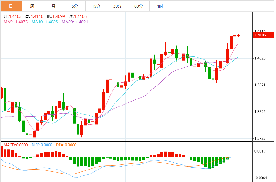 技术日线图上,美元/加元交易于1.4043。 该货币对保持在上升的50日指数移动平均线(EMA)1.3970和200日EMA 1.3911之上,强化了看涨偏向。 两个均线的正斜率保持了上涨趋势的完整性。 相对强弱指数(RSI)为54(中性),正在上升,表明动能增强。