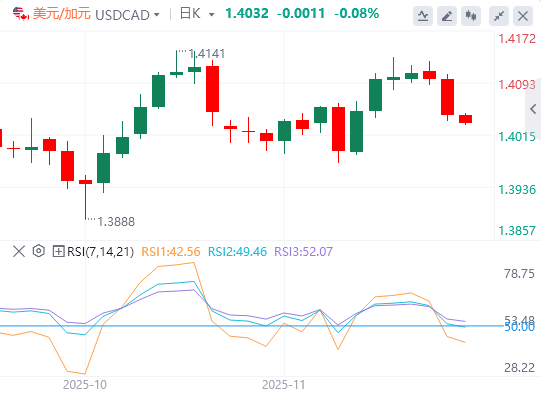 美元兑加元汇对维持在上升的50日指数移动平均线(EMA)1.3990上方,而九日EMA在1.4059上方。这使整体偏向受到中期平均值的支持,但短期动能在短期指标下受到限制。