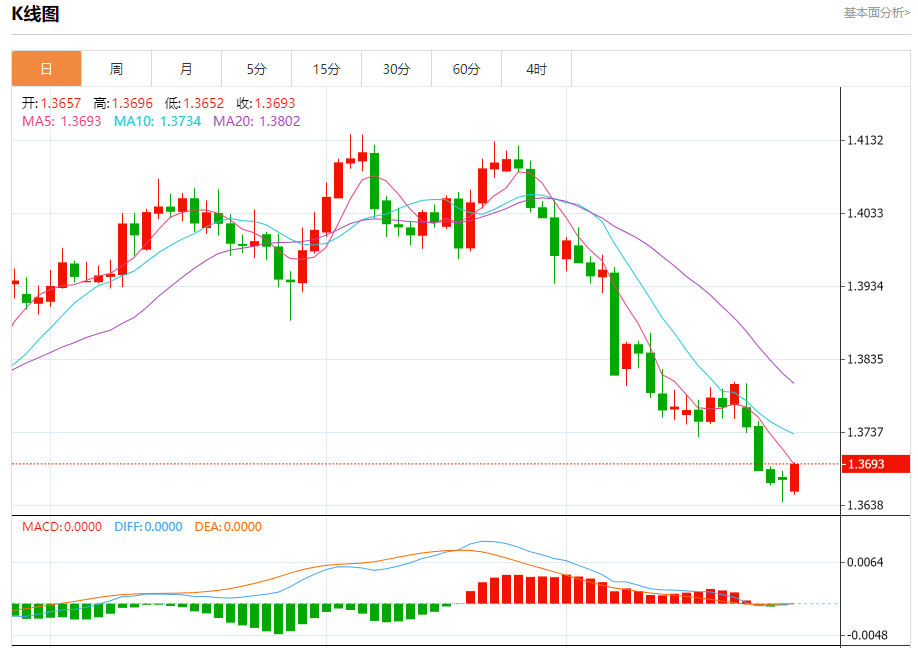 14日相对强弱指数(RSI)为30.69,接近超卖,并从近期低点略有上升,显示出卖压减弱。 从1.3540低点到1.4139高点的78.6%回撤位在1.3668提供了附近支撑。