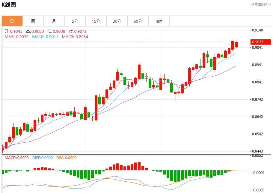 周四纽盘,瑞郎兑美元交投于0.9083,涨幅为0.04%。