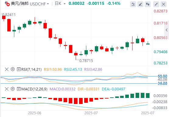 该货币对的第一个下行目标出现在0.7947,即7月16日的低点。长期下跌可能会导致跌至关键支撑位0.7900,这是布林带的心理水平和下限。美元/瑞郎的下一个争夺水平是0.7872,即7月1日的低点。