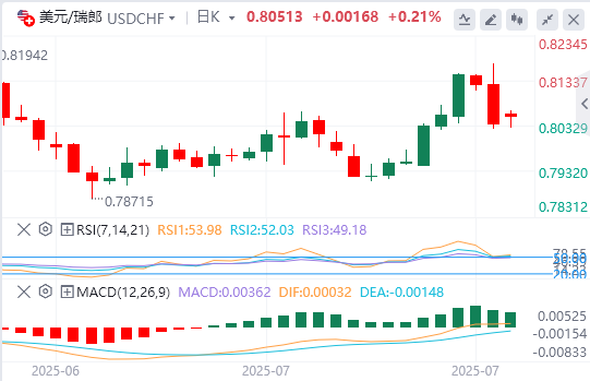 美元/瑞郎的关键支撑位位于0.8000心理关口。突破该水平可能会导致跌至7月23日的低点0.7911。持续低于上述水平的交易可能会暴露布林带下限0.7885。