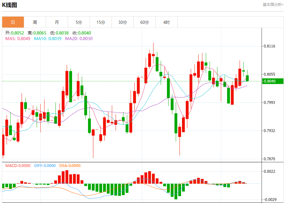 周三纽盘,瑞郎兑美元交投于0.8040,跌幅为0.28%。