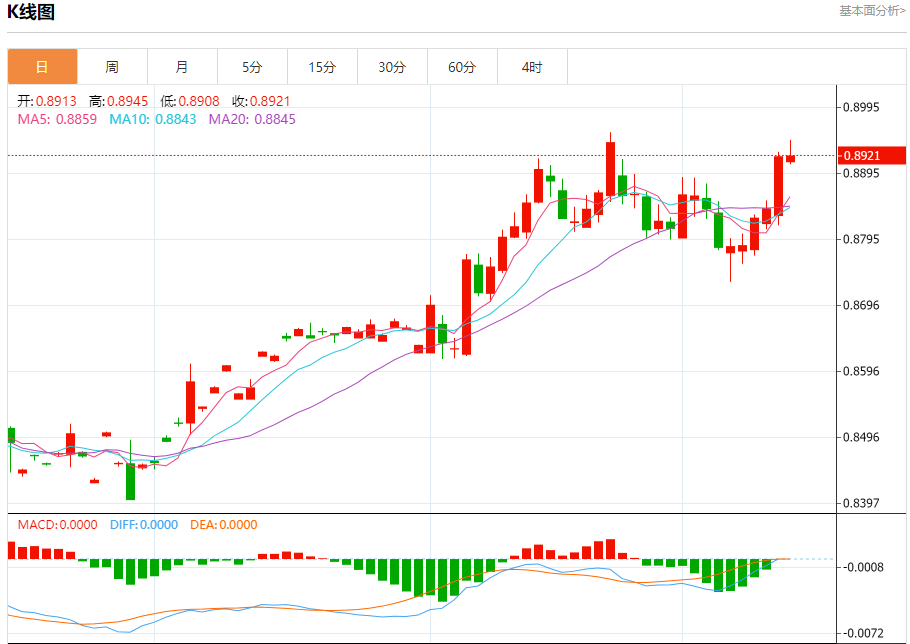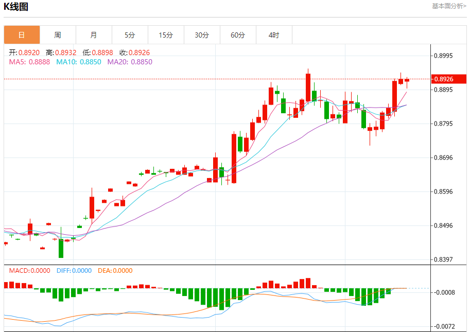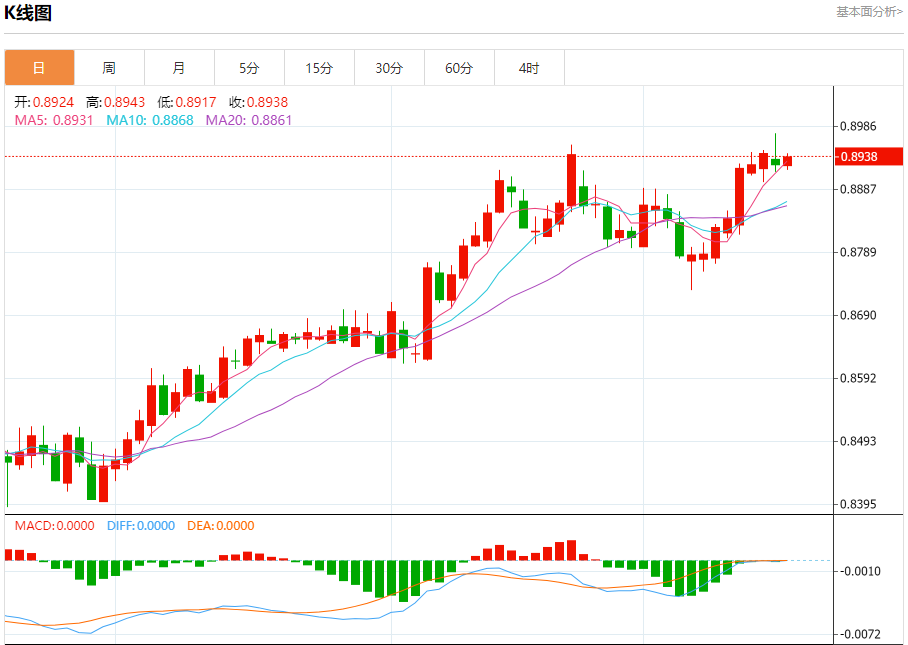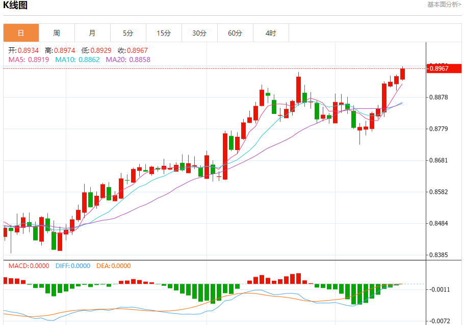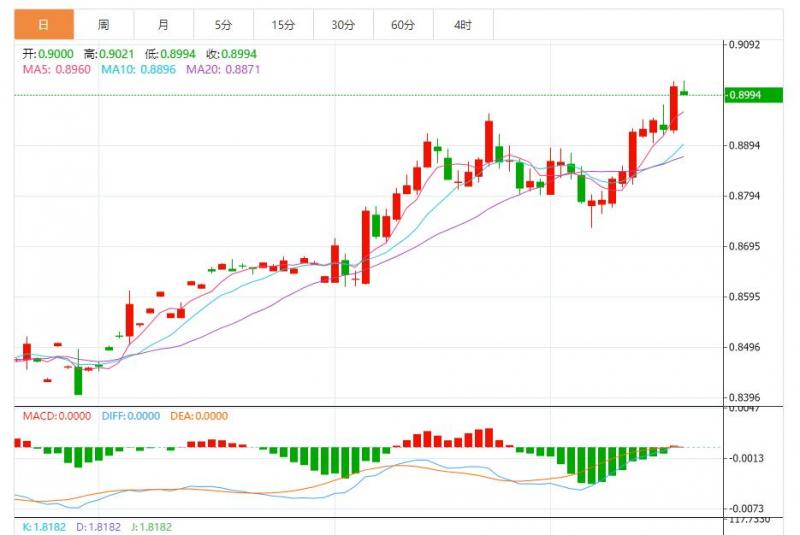 美元兑瑞郎今日汇率最高0.9021,最低0.8994,涨跌-0.0014,涨跌幅-0.16%。 市场基本面分析 市场普遍预计瑞典央行将降息多达50个基点,美元周三上涨,触及两年来的最高水平108.260,此前美联储一如普遍预期宣布降息,同时暗示将放缓货币政策宽松周期的步伐。 美元兑瑞郎走势预测 美元兑瑞郎