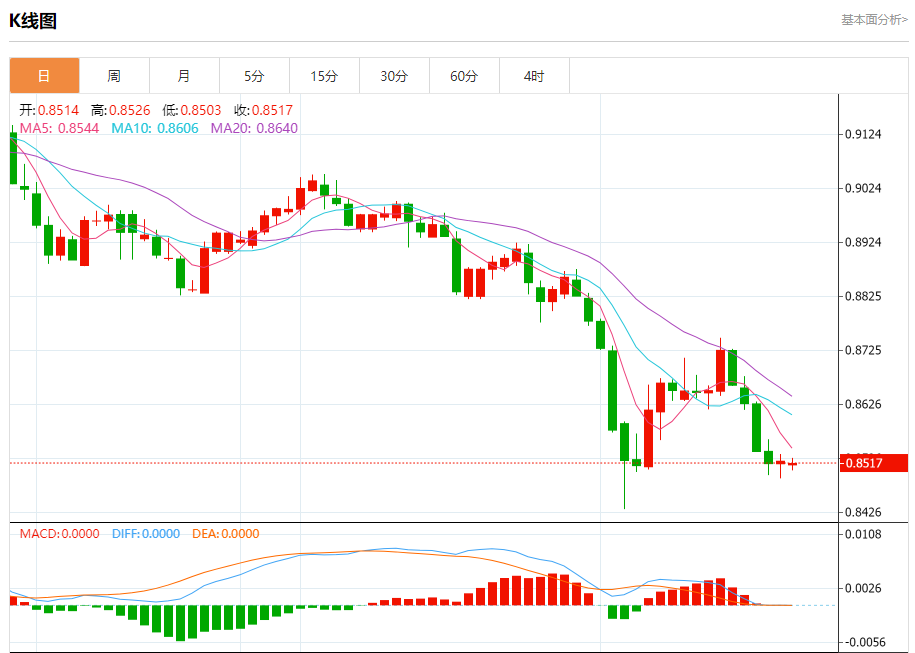 周四盘中,美元/瑞元报0.8494,涨幅0.28%. 今日分析:在0.8540之下,看跌,目标价位为0.8490,然后为0.8470。 技术点评:跌破0.8490位置,将会引发下跌至0.8470。 支撑位:0.85800.85600.8540 阻力位:0.84900.84700.8440 (亚汇网编辑:静香)
