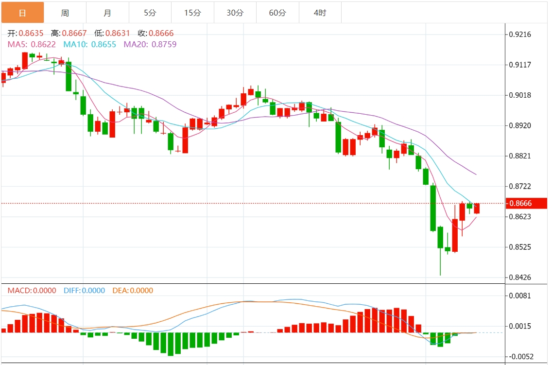 周一盘中,美元/瑞元报0.8638,跌幅0.27%. 今日分析:在0.8670之下,看跌,目标价位为0.8620,然后为0.8600。 技术点评:跌破0.8620位置,将会引发下跌至0.8600。 支撑位:0.87100.86950.8670 阻力位:0.86200.86000.8580 (亚汇网编辑:静香)