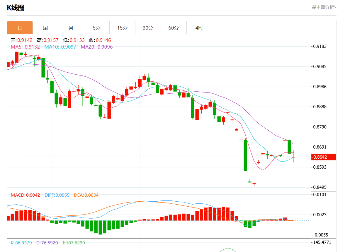 周二盘中,美元/瑞元报0.8610,跌幅0.19%. 今日分析:在0.8640之下,看跌,目标价位为0.8600,然后为0.8580。 技术点评:只要0.8640阻力位不被突破,向下跌破0.8600位置的风险很高。 支撑位:0.86750.86550.8640 阻力位:0.86000.85800.8560 (亚汇网编辑:静香)