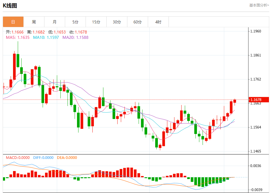 今日周四,截止目前欧元兑美元报1.1679,上涨0.07%。