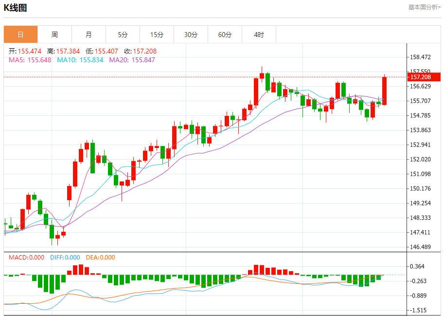 今日周五,截止目前美元兑日元报157.327,上涨1.20%。