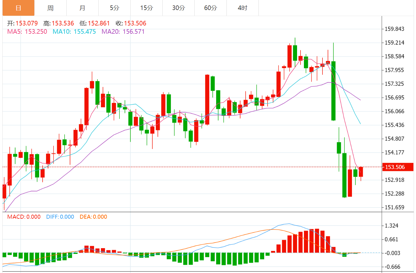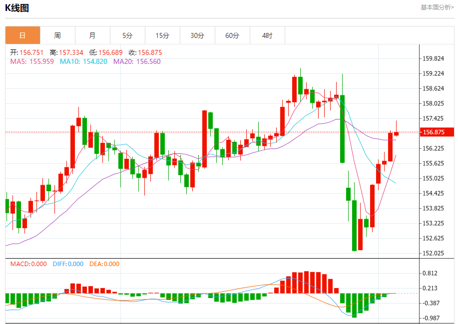 今日周四,截止目前美元兑日元报157.217,上涨0.23%。