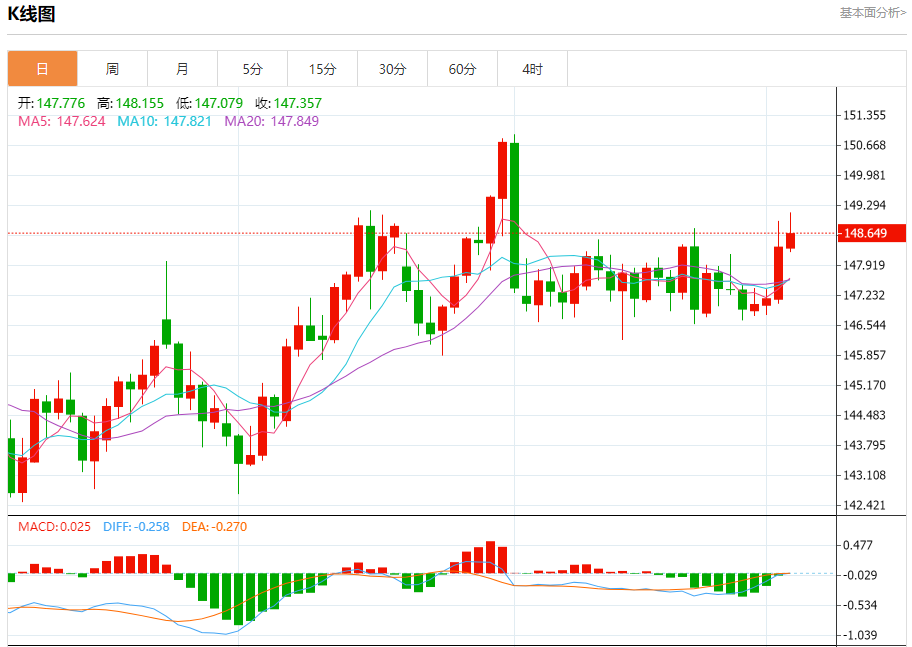 美元兑日元今日汇率最高148.604,最低148.576,涨跌0.235,涨跌幅0.16%。 市场基本面分析 这一政治不确定性给日本首相石破茂带来更大压力,并进一步加剧了日元的贬值。市场正密切关注美元兑日元是否能突破关键阻力位,即200日均线148.88,若成功突破,可能将为上探150.91的八月高点打开通道。面对这一风险