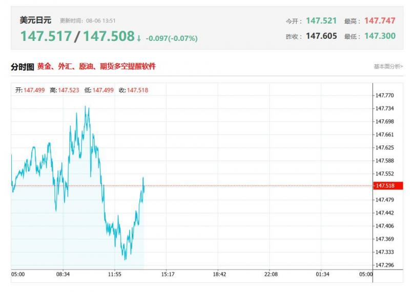 8月6日,周三亚市盘中,日元兑美国日元在区间内震荡,在宏观数据发布后几乎没有波动。日本6月份经通胀调整后的实际工资连续第六个月下降,加剧了人们对消费主导复苏的担忧。这是在国内政治不确定性之上的,并缓和了对日本央行立即加息的押注。除此之外,股市稳定的迹象对避险货币日元构成了阻力。 与此同时,日本央行在