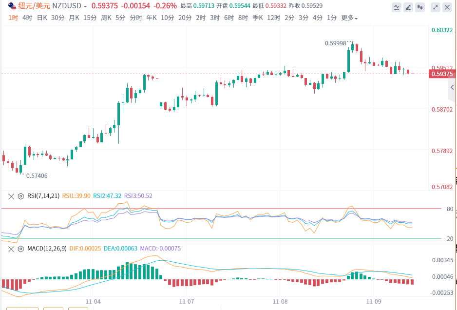 11月9日,周二,欧市盘前,纽元/美元未能突破0.5960的短期阻力位后转为盘整。 随着投资者在美国通胀数据前转为观望,风险情绪变得十分平静。截至发稿,纽元/美元报价0.5937。