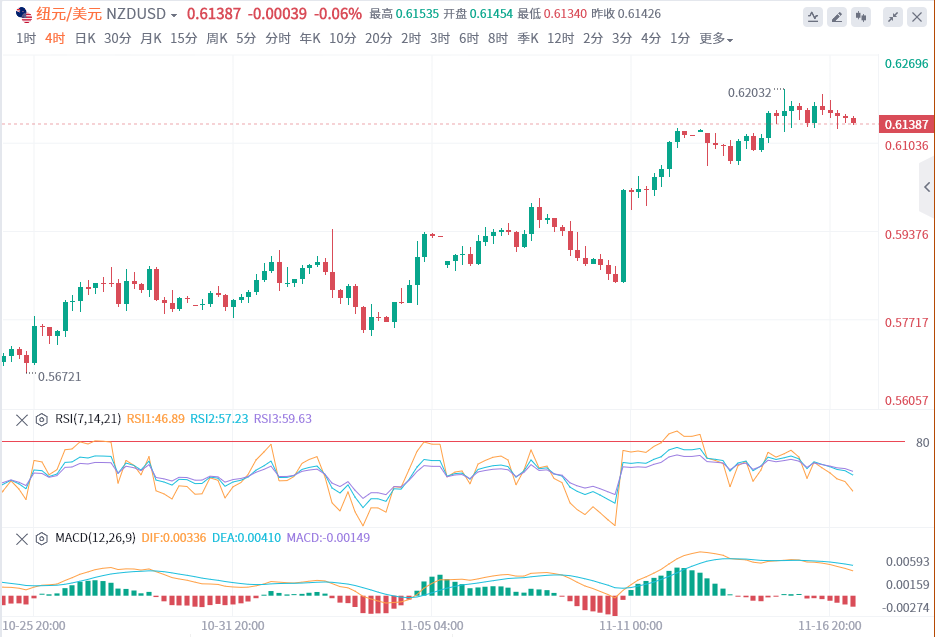 纽元/美元可能正见顶,但今日是本周市场交投淡静的一天。 纽元兑美元徘徊在0.6150附近,处在隔夜高点0.6193和0.6128区间。小时图表和以下的4小时图来看,纽元兑美元各个周期的技术形态已经见顶,4小时图显示纽元/美元可能会构筑三顶形态。