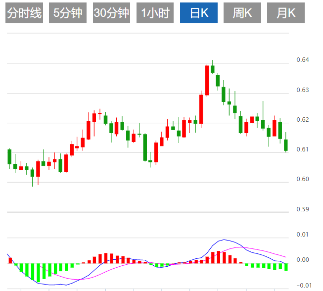 从技术面看,现货价格目前跌破了自年度低点(5月31日)以来的上行趋势线提供的支撑位。此外日图震盪指标再度开始下跌,支持价格延续三週的跌势。不过看跌交易员可能仍将等待跌破0.6100关口后在建立新的押注。