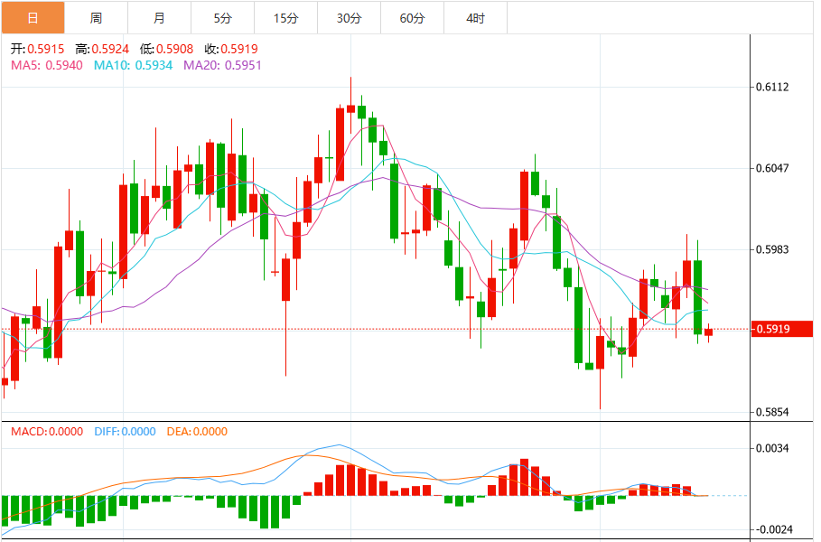 技术上,纽元/美元在0.6000的心理关口附近遭遇到了一定的压力,并且出现了回落,当前价格回撤至0.5950区域,打破了连续两天的上涨趋势。当前的价格走势表明市场对于0.6000的阻力位存在较强的抑制力量。价格目前处于布林带中轨附近,表明市场仍在整理阶段。布林带宽度较为稳定,未出现过度扩张,表明市场波动性尚处于正常范围。价格突破布林带的上轨可能会推动价格进一步上涨,反之则可能回测至下轨。