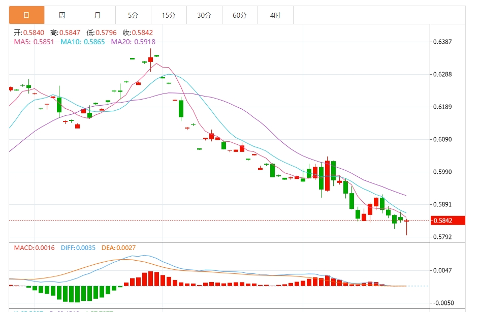 纽元兑美元今日汇率最高0.5881,最低0.5827,涨跌0.0031,涨跌幅0.53%。 市场基本面分析 新西兰储备银行(RBNZ)周三作出利率决定后,纽元(NZD)打破了兑美元(UD)连续五天的下跌。新西兰央行宣布进一步下调官方现金利率(OCR),在11月将其从4.75%下调50个基点(b)至4.25%。新西兰储备银行以黯淡的