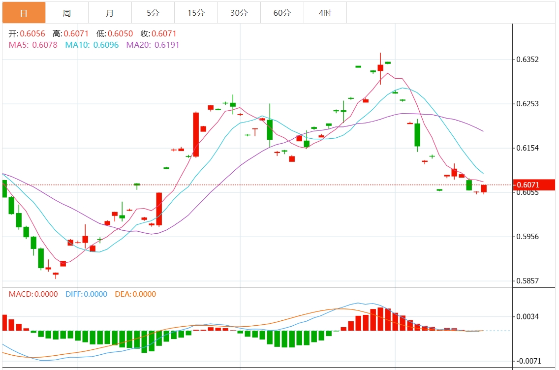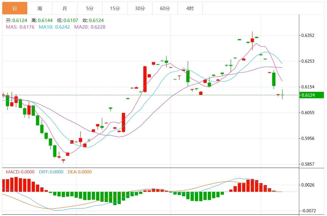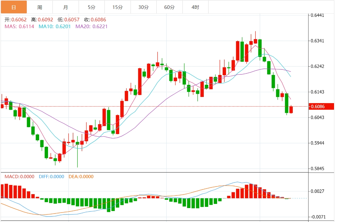 周四亚盘,纽元/美元徘徊于0.6071附近,日内上涨0.25%。技术指标仍空头居多,显示主导近期交易时段的卖压仍在持续。 通膨率疲软的数据引发了新西兰纽储行(RBNZ)可能连续第二次下调官方现金利率(OCR)的预期,下调幅度将大于平常的50个基点(b)。 与此同时,美元(UD)创下两个月来的新高,因为交易商已经排除了美