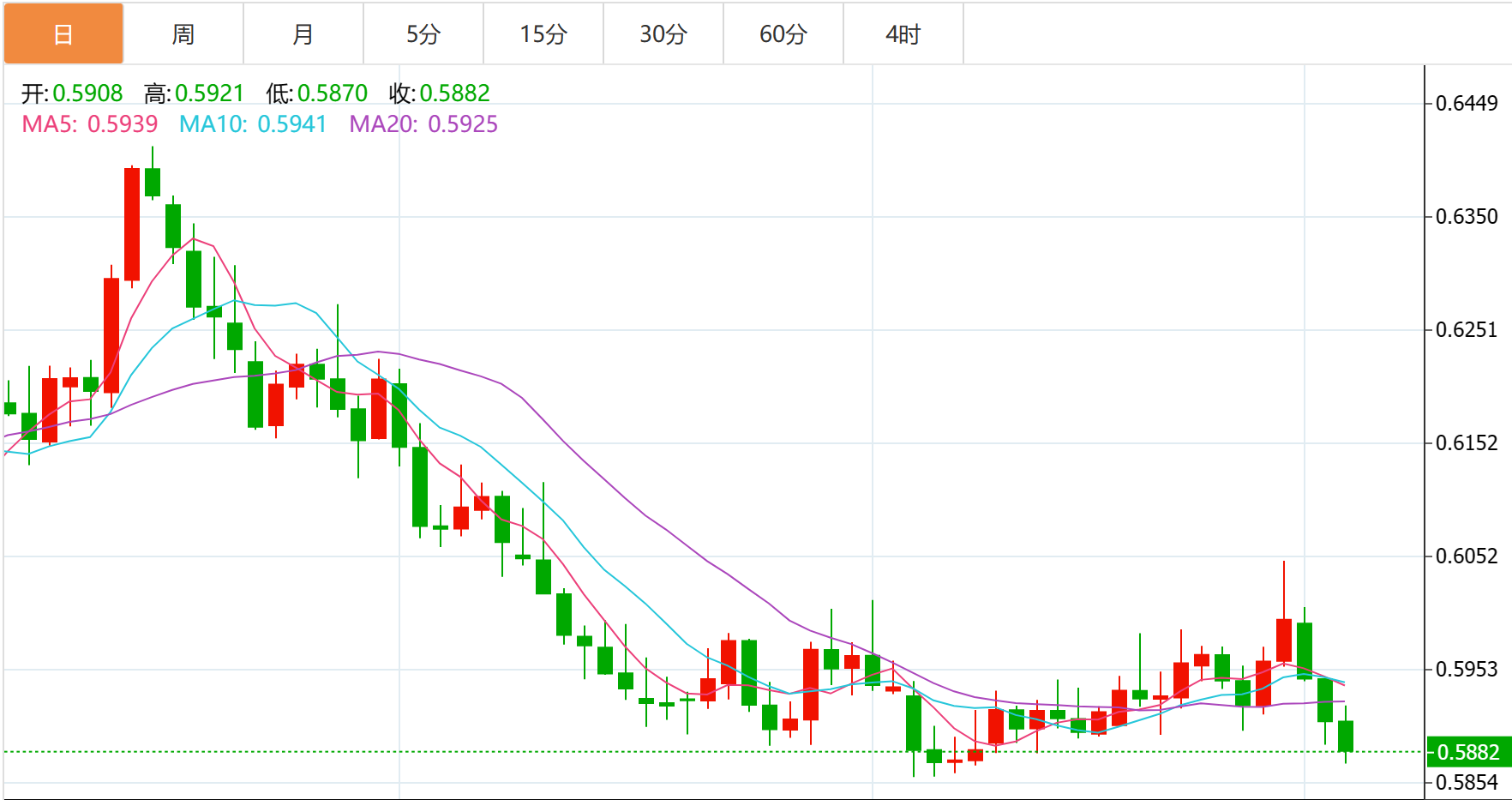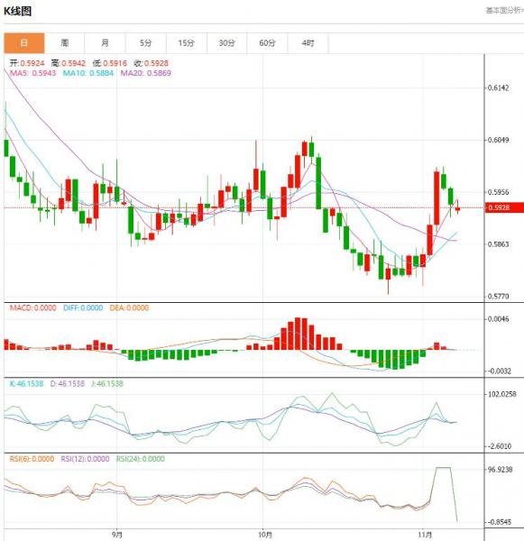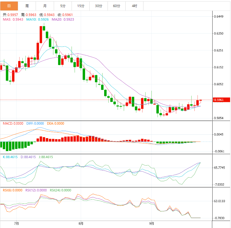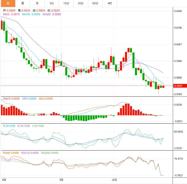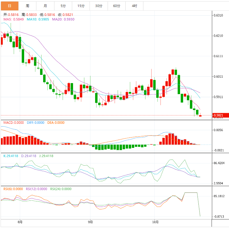 纽元/美元周五连续第三天下跌,并于亚市触及一周新低0.5920-0.5915附近。中国公布通胀数据后,纽元/美元仍处于守势,似乎易于延续近期从0.6055区域即周三触及的两个月高点大幅回调的走势。 中国国家统计局公布的数据显示,9月中国居民消费价格指数月率上升0.2%,年率持平,均低于市场预期。此外,9月中国生产者价格指数