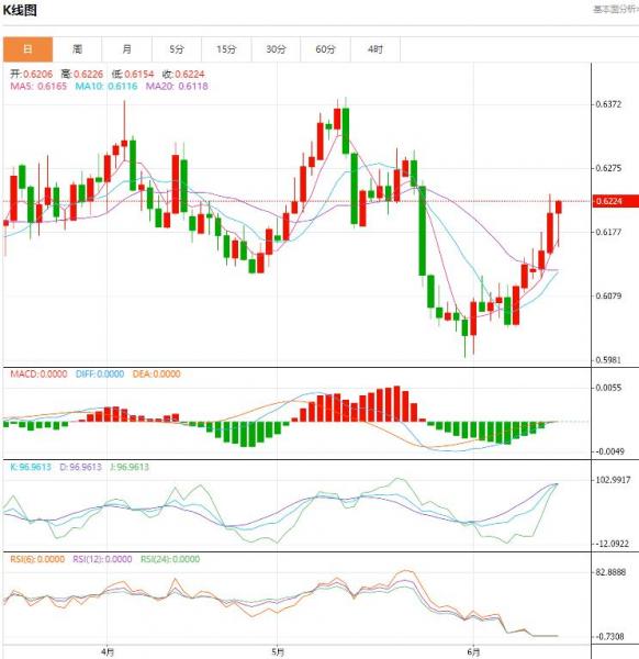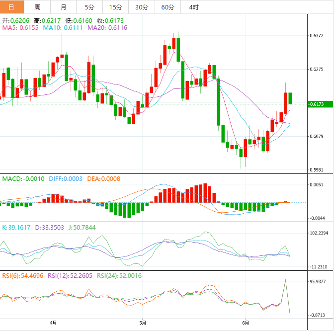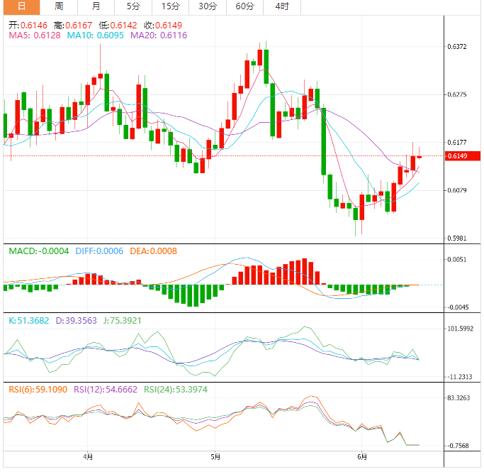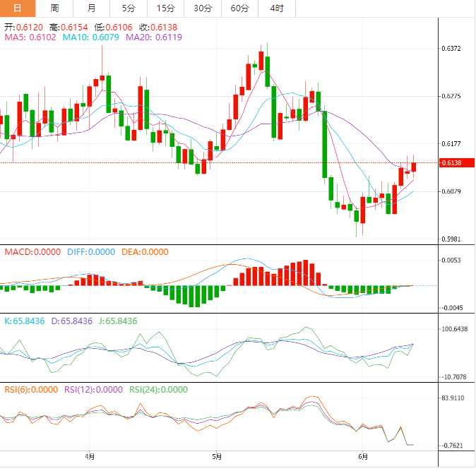 周二盘中,纽元兑美元上涨至0.6149,涨幅0.42%。 基本面上,纽元兑美元有望收复前日高点0.6150。由于美元在美国通胀数据前方向不明,汇价正积聚动能。此次,美国5月通胀数据备受期待,因为这将为美联储的政策提供关键指引。美国就业市场状况开始释放热量,经济活动依然疲弱,美国通胀率进一步走软将提升美联储采取中性