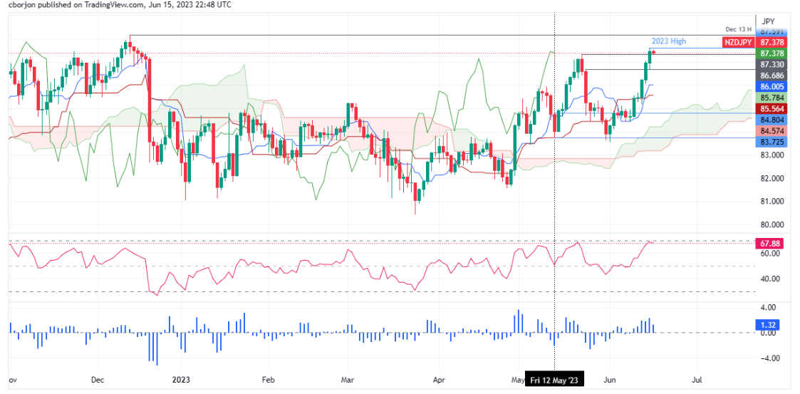 周五亚盘,纽元/日元小幅回调,周四纽元/日元持稳上涨0.58%,并触及年初至今(YTD)新高87.59。发稿接受采访时,纽元/日元几乎持平,交投于87.40。 从日线图来看,纽元/日元仍然偏向于上涨,原因是纽元/日元仍然在一目均衡图云图上方。此外,转换线在基准线上方交叉,表明多头仍佔据主导。但基准线斜率在过去九天炎湮