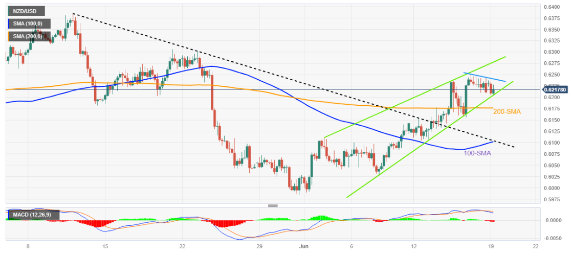 纽元/美元从盘中低点反弹,因为它在欧洲週一早些时候努力确认两星期前的上升楔形看跌图表形成。也就是说,纽元/美元在0.6215附近舔舐伤口,同时保持前一天从月度峰值的回撤。 值得注意的是,较低的高点形成与看跌的ACD信号一起,引诱纽元/美元的卖家。然而,在截稿时,所述的上升楔形下限约0.6200的明显下行,成为卖家