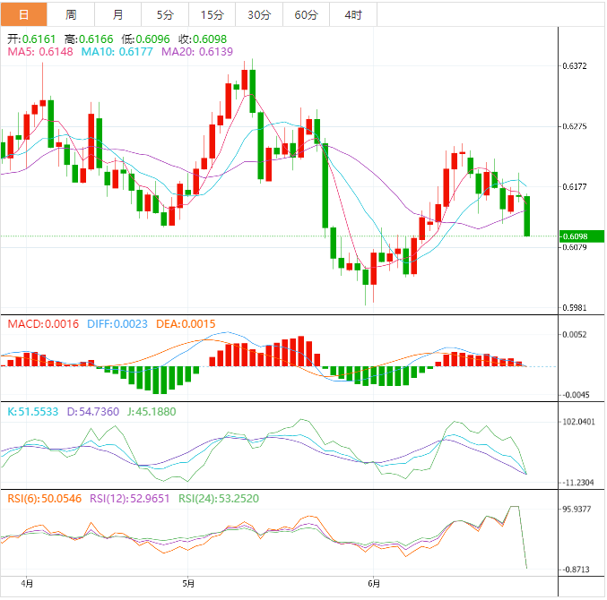 周三盘中,纽元兑美元下跌至0.6099,跌幅1.04%。 基本面上,纽元/美元在欧市早盘录得两周新低0.6113。由于需求黯淡且出口疲弱,中国经济前景恶化,预计该货币对进一步下跌。中国国家统计局报告称,由于家庭需求疲软,5月份企业利润下降了12.6%,高于4月份18.2%的下跌。值得注意的是,新西兰是中国的主要贸易伙伴之一,