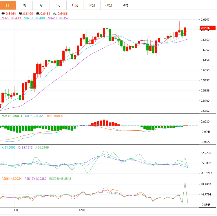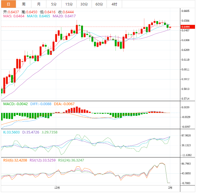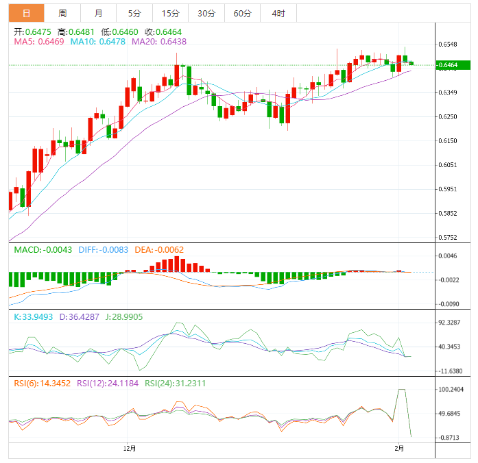周三盘中,纽元兑美元上涨至0.6446,涨幅0.12%。 基本面上,由于就业数据(第四季度)和财新制造业I数据的公佈,纽元在亚洲时段仍然极为波动。就业变化从预期的0.3%和之前公佈的1.3%下降到0.2%。此外,季度劳动力成本指数为1.1%,低于预期的1.3%,但与之前公佈的1.1%相近。 技术面上,纽元兑美元稳定在A50下方,这对价