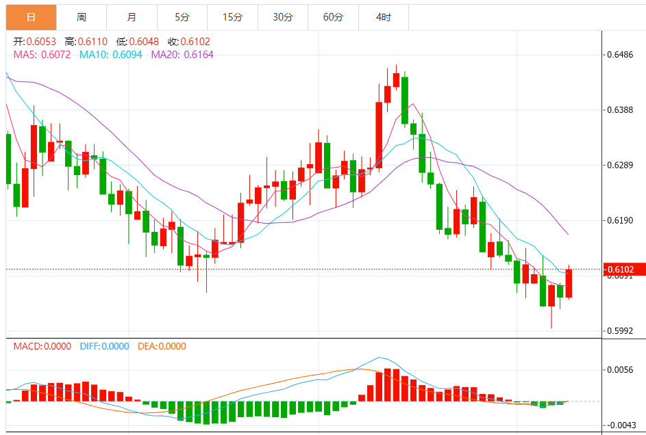 周一亚市开盘纽元/美元震荡于0.6080附近后大幅上涨。纽元/美元已出现垂直上行趋势,已收复0.6100关键阻力位,预计纽元/美元将继续以强势上涨。上周纽元/美元多头在触及心理支撑位0.6000附近的低点后显示出反转信号。 继中国消费者价格指数公布后澳新货币出现下跌后出现走强。中国消费者价格指数年率录得2.5%,低于期值