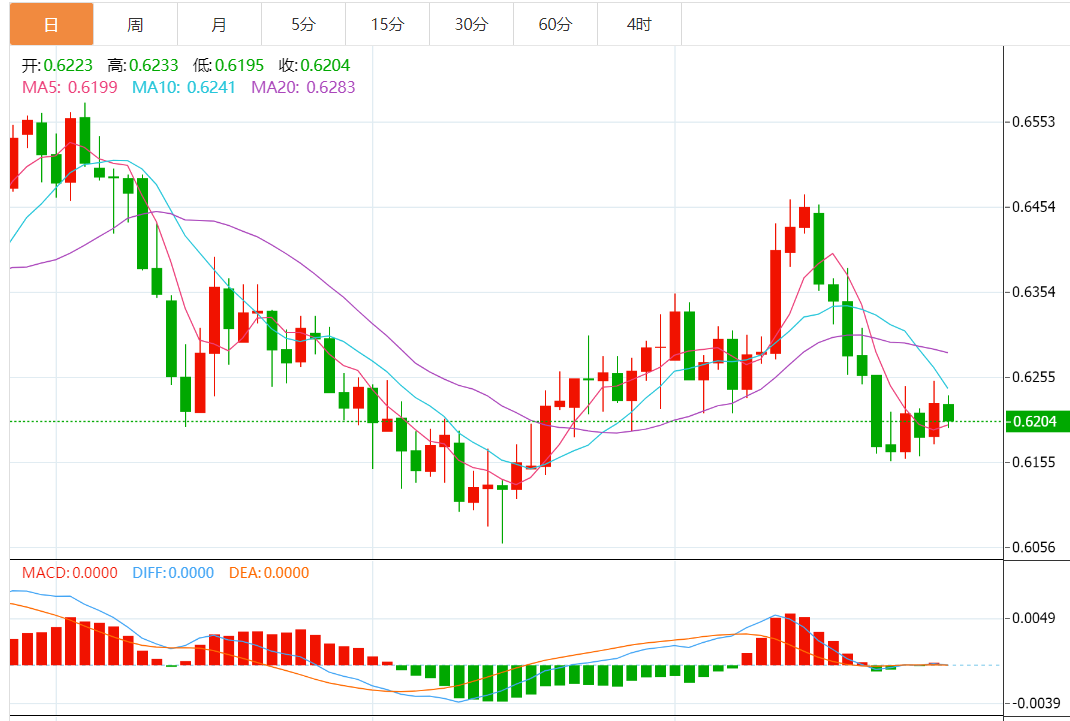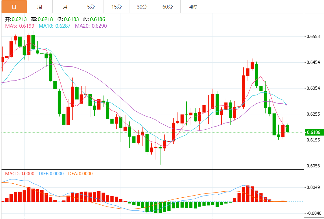 纽元兑美元因获利了结而下跌,触及20日均线,并将其推至阻力位0.6225,但前提是0.6190线守稳。 今天的预期交易区间在0.6190支撑位和0.6240阻力位之间。 今日预期趋势:看涨