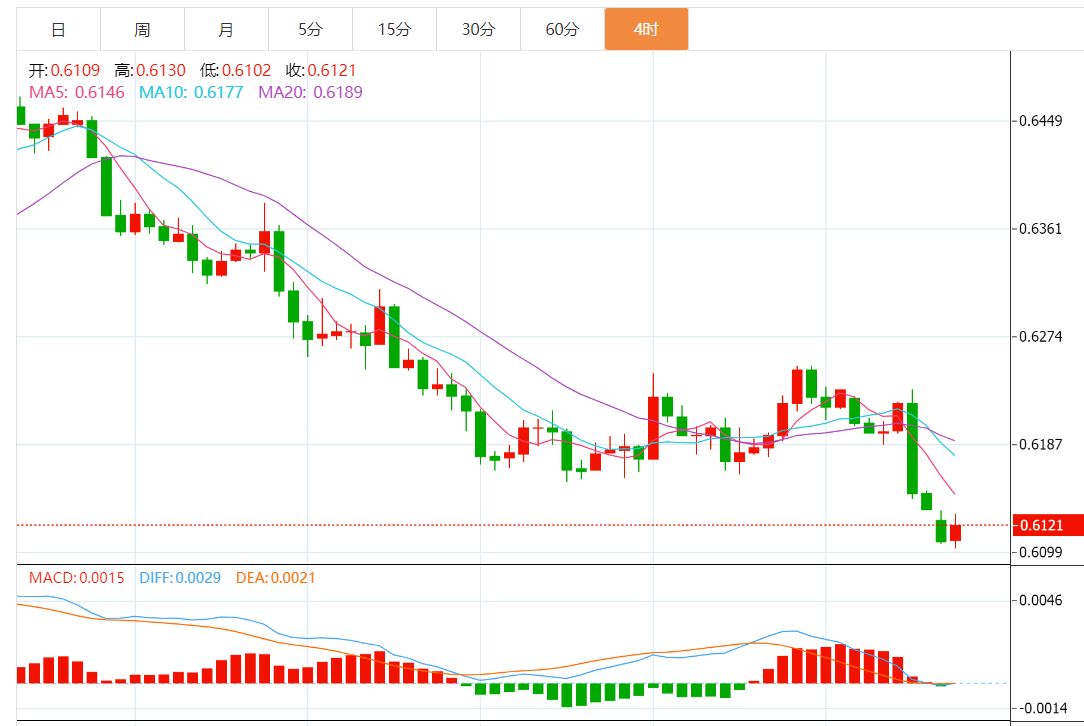 周二,纽元兑美元徘徊在0.6140附近。纽元汇率已从1.5个月低点回升,并从0.6168回落。 纽元兑美元价格保持在0.6100以上之前,它不会从现在的位置下跌。 一个负面的趋势线已经持续了一周,在0.6085附近也提供了支撑。 即使纽元兑美元跌破0.6085,该报价也需要从7月份的低点(约0.6060)得到确认,才会达到重要的心理关口0