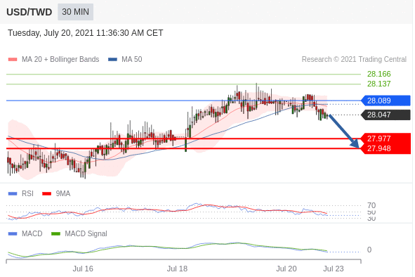 看跌,在28.089之下。 28.089作为转折点。 交易策略:看跌,在28.089之下。 备选策略:如突破28.089,UD/TWD目标方向为28.137和28.166。 技术点评:RI技术指标小于中性区域50。ACD技术指标处在其信号线之下看空。此外,价位低于其20天及50天移动平均线(分别位于28.072和28.078)。 阻力位: 28.166** 28.137* 28.089** 28.