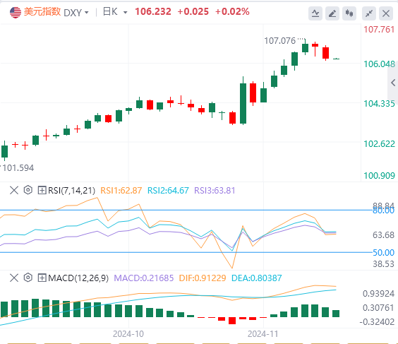 美元周一在相当高的水平上守住,本周开盘非常平静,衡量美元兑六种主要货币价值的美元指数(DXY)在上周四触及的年内新高106.50上方附近略微下跌。周一货币的主要驱动力是拜登政府周日为乌克兰使用美国远程导弹瞄准俄罗斯境内的俄罗斯基础设施开了绿灯,就在本周一在里约热内卢举行的G20会议之前。