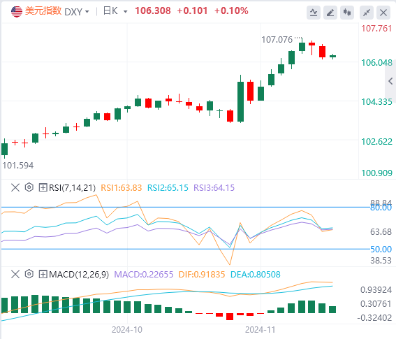 日线图上的看涨势头有所缓解,而涨势从接近超买的状态回落。日线 MACD 上可能正在形成潜在的看跌背离。短期风险仍然偏向于技术性回撤走低。支撑位在 105.60(76.4% 斐波那契)和 104.50/60 水平(21DMA,2023 年高点到 2024 年低点的 61.8% 斐波那契回撤位)。阻力位在 107、107.40(2023 年高点)。