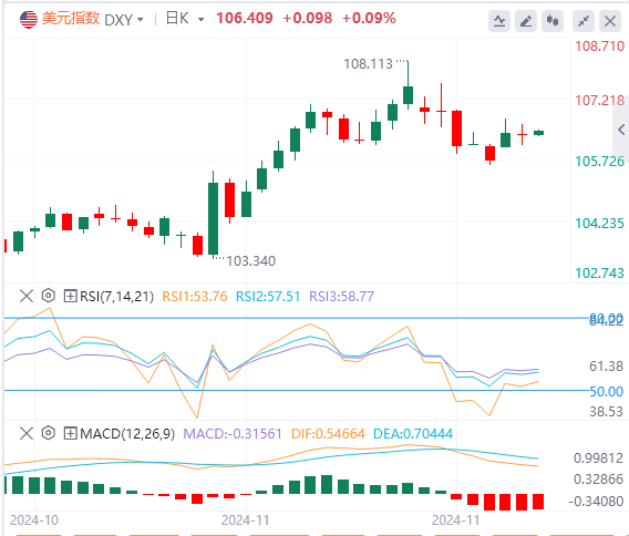 相对强弱指数(RSI)和移动平均收敛散度(MACD)等技术指标表明信号喜忧参半,但上升趋势可能会继续。MACD低于其信号线,表明存在看跌势头,但RSI在50上方保持坚挺。关键支撑位在106.00-106.50,阻力位在107.00。