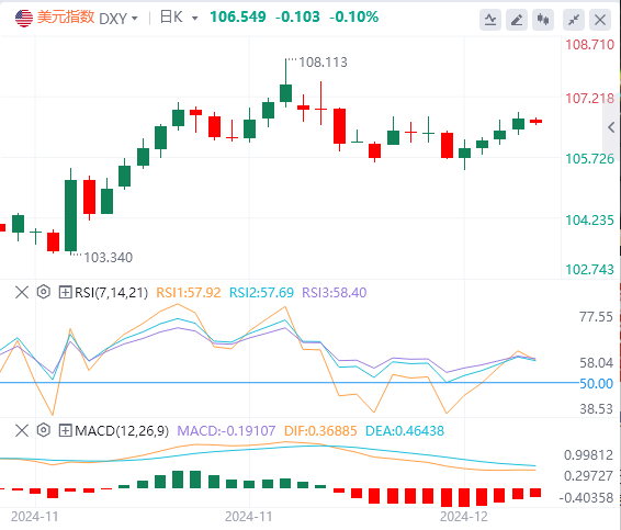 由于剩余数据点数量有限,美元指数正在定义可能维持到明年的区间。美元多头已经收复4月16日高点106.52,这是一个很难突破的买入点。接下来是107.00整数关口和2023年10月3日高点107.35。再往上,11月22日高点108.7出现。