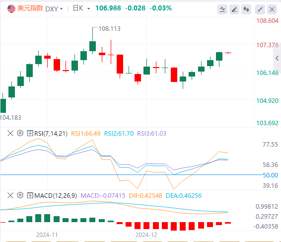 美元指数周四止住近期跌势并收复部分失地,尽管市场情绪数据好坏参半,且市场猜测美联储将放缓加息周期,但美元指数仍成功守住106.00上方。相对强弱指数(RSI)和移动平均收敛散度(MACD)指标也表明该指数具有弹性并可能继续走高。美元指数在106.50-107.00处面临阻力,若收复该区域,则可能重新测试108.00区域。