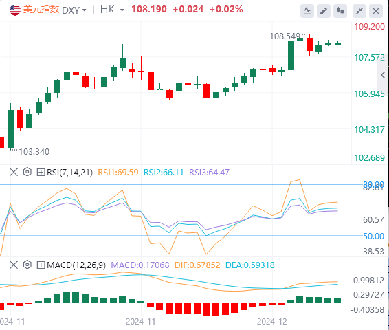 枢轴点107.93美元是关键支撑位,直接阻力位在108.54美元。持续突破该阻力位可能会推动该指数升至108.90美元,反映出美元持续走强。