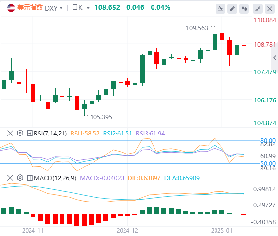 美元指数整体维持看涨格局,技术指标保持上行势头,尽管盘中有所走软,但美元指数成功守住20日简单移动平均线(SMA),反映出基础支撑位的稳健。