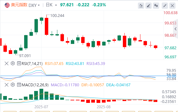 下行方面,美元指数的初步支撑位可能瞄准7月24日创下的八周低点97.11,随后是96.38,这是自2025年7月1日创下的2022年2月以来的最低水平。进一步下跌将促使美元指数测试下降通道的下边界96.10附近。