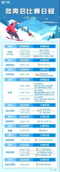 据央广网,北京冬奥会各项赛事继续激烈角逐,2月10日赛程日历出炉,一图速览↓↓↓ 据潇湘晨报,2月10日,将在单板滑雪、高山滑雪、花样滑冰、速度滑冰、雪橇、越野滑雪、自由式滑雪等大项中产生8枚金牌。中国军团看点多多,将在多个项目上向奖牌发起冲击。冰壶女子循环赛,中国队将先后对战丹麦和瑞士;男子冰壶将