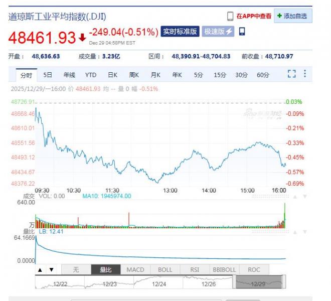 2025年12月30日星期二,以下是由亚汇网整理的昨夜今晨国际财经要闻汇总: 国际股市 一、美股股市:截至收盘,道指跌249.04点,跌幅为0.51%,报48461.93点;纳指跌118.75点,跌幅为0.50%,报23474.35点;标普500指数跌24.20点,跌幅为0.35%,报6905.74点。美光科技(U.U)涨3.4%,股价触及历史新高;特