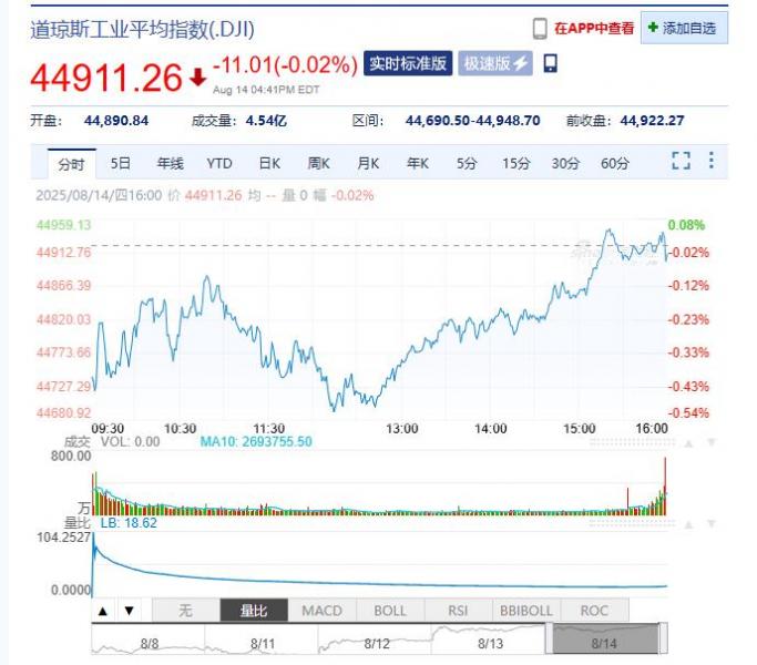 2025年08月15日星期五,以下是由亚汇网整理的昨夜今晨国际财经要闻汇总: 国际股市 一、美股股市:道指跌11.01点,跌幅为0.02%,报44911.26点;纳指跌2.47点,跌幅为0.01%,报21710.67点;标普500指数涨1.96点,涨幅为0.03%,报6468.54点。英特尔(INTC.U)涨7.38%,纳斯达克中国金龙指数跌2.13%,阿里